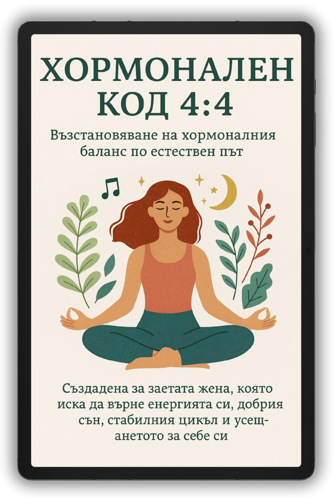 Хормонален код 4:4 е аудио система, която използва комбинация от древни природни практики, научно потвърдени билки и ритъмна терапия, за да възстанови хормоналния баланс на женското тяло – без лекарства, без диети, без претоварване. Създадена е за заетата жена, която иска да върне енергията си, добрия сън, стабилния цикъл и усещането за себе си – без да се губи в търсене и хаос.